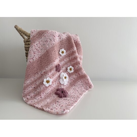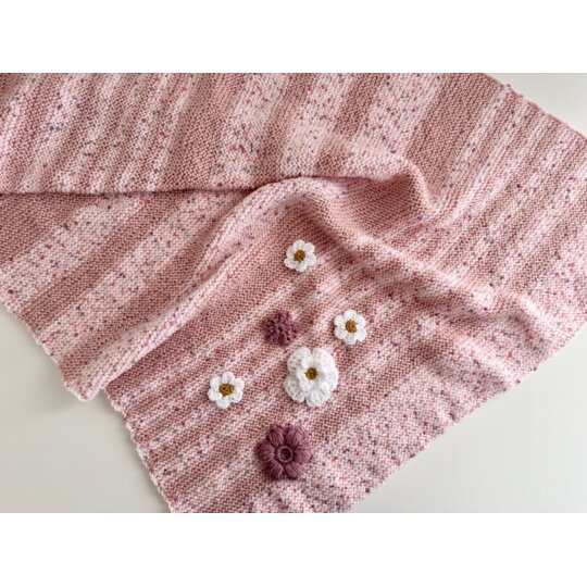 Mályva cirmos kötött takaró, horgolt virágokkal